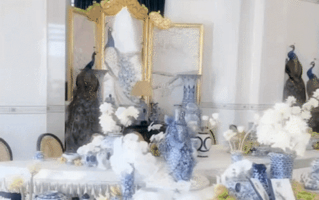 Đặc biệt, nếu cổng cưới Long - Phụng là "đặc sản" quen thuộc trong các đám cưới hào môn, thì đại thiếu gia Bạc Liêu lại chọn một lối đi riêng tinh tế hơn. Cổng hoa và không gian bên trong được tô điểm bằng hình ảnh cặp khổng tước trắng. Loài chim biểu tượng cho sự vương giả, thanh thoát này không chỉ tạo ra sự đồng điệu tuyệt đối với bộ gốm sứ mà còn nâng tầm thẩm mỹ cho toàn bộ không gian.