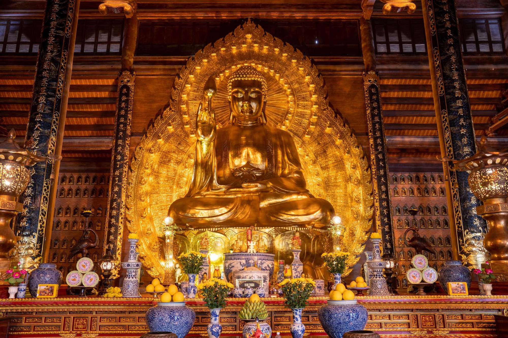 Nằm uy nghi giữa Điện Giáo Chủ, bức tượng Thích Ca Mâu Ni cao 10 mét, nặng 100 tấn hiện là pho tượng đồng nguyên khối dát vàng lớn nhất Việt Nam và đã được Trung tâm Kỷ lục Châu Á vinh danh. Tuy nhiên, điều khiến giới chuyên môn và du khách thực sự sốc không chỉ nằm ở khối lượng vàng đồng khổng lồ, mà ở một phương thức thi công vô cùng kỳ lạ.
