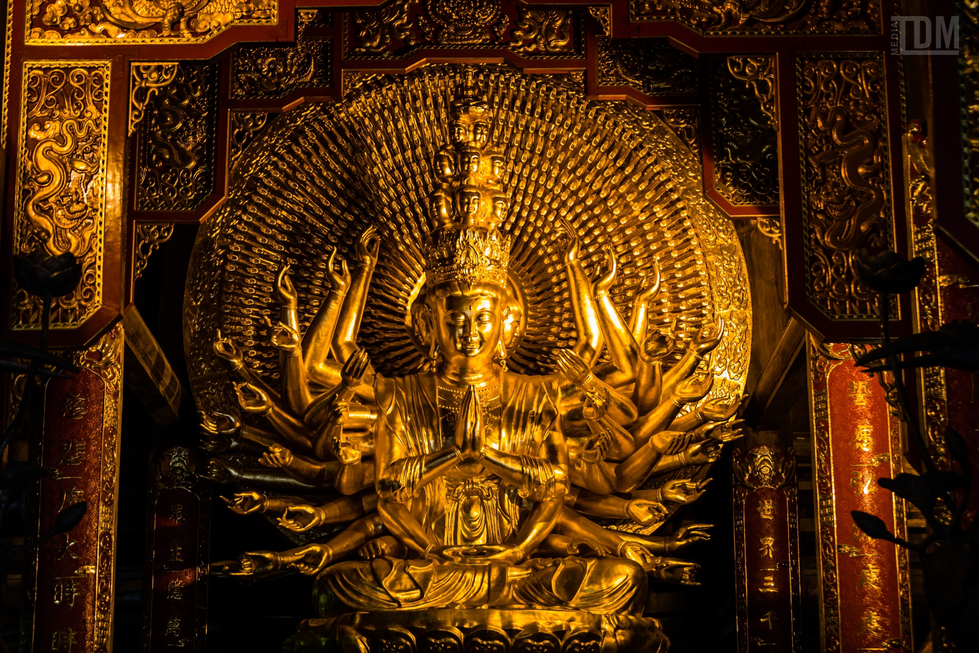 Sự đồ sộ còn được nhân lên gấp bội với quả chuông đồng 36 tấn nằm phía trên một chiếc trống đồng khổng lồ nặng 70 tấn, âm vang cả một vùng đồi núi. Cùng với đó là hành lang La Hán dài kỷ lục 1052 mét, nơi đặt 500 bức tượng bằng đá xanh nguyên khối. Mỗi bức tượng cao 2,5 mét và nặng khoảng 4 tấn, mang những biểu cảm hỷ nộ ái ố hoàn toàn khác biệt để miêu tả trọn vẹn sự sống chốn trần thế.