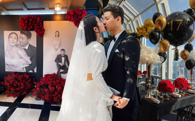 Không gian lễ ăn hỏi được trang trí bức tường hoa acrylic, bánh nhiều tầng hình rồng – phượng trên ngôi chùa, cùng 188 quả táo tượng trưng cho hôn nhân hạnh phúc và 288 gói bánh truyền thống. Tiệc trước cưới tổ chức tại ION Sky cũng gây choáng: hơn 15 nghìn quả bóng bay, vô số bông hồng đỏ, khung cảnh lộng lẫy mất 19 tiếng để chuẩn bị. Kim Lim đeo vòng cổ 400 nghìn USD do bố tặng, diện đồ đen cùng hôn phu, khiến mọi chi tiết đều sang trọng đến tột cùng.