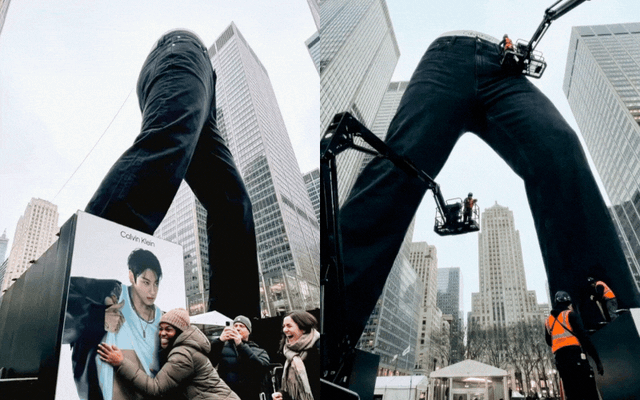 Ở một số góc nhìn khác, người qua đường và fan hâm mộ đang tranh thủ check-in cùng tác phẩm, có người đứng lọt thỏm trong ống quần khổng lồ, người khác thì ôm hôn hình ảnh của Jung Kook được in quanh khu vực trưng bày. Xung quanh công trình còn được dựng rào chắn phủ kín hình ảnh nam idol trong campaign mới của Calvin Klein cho dòng Baggy Jeans.
