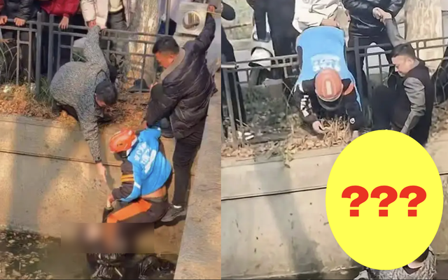 Đoạn video lan truyền trên mạng xã hội cho thấy, một bé trai mặc đồ đen đang trôi nổi dưới dòng kênh đục. Trên bờ, nam shipper mặc đồng phục giao đồ ăn cùng nhiều người dân lập tức lao vào ứng cứu. Anh bám chặt lan can, trong khi những người xung quanh giữ chặt phía sau để làm điểm tựa, rồi thò chân xuống nước, cố gắng để cậu bé bám vào. Tuy nhiên, do dòng nước và địa hình trơn trượt, việc cứu nạn gặp nhiều khó khăn.