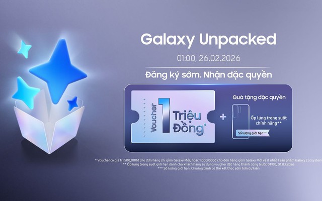Để chào đón sự kiện quan trọng này, Samsung triển khai chương trình ưu đãi đặc biệt dành cho khách hàng đăng ký sớm. Cụ thể, từ 06:00 ngày 11/02/2026 đến 00:59 ngày 26/02/2026, người dùng khi tham gia khảo sát tại www.samsung.com/vn/unpacked sẽ nhận ngay voucher lên đến 1 triệu đồng để đặt trước Galaxy mới kèm các sản phẩm thuộc hệ sinh thái Galaxy, cùng quà tặng ốp lưng trong suốt chính hãng với số lượng giới hạn. Đây là cơ hội hiếm có để trở thành một trong những người đầu tiên khám phá kỷ nguyên AI di động mới của Samsung.
