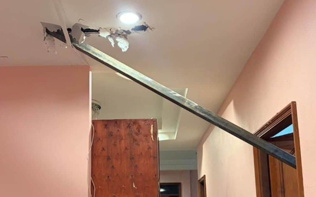 Sự việc xảy ra vào đêm thứ Tư, ngày 14 tháng 1 vừa qua. May mắn thay, không có ai bị thương. Chủ nhà là một phụ nữ đã chia sẻ video về vụ việc gây sốc này trên mạng xã hội, cho thấy một thanh thép dài xuyên qua mái nhà của cô vào khoảng 8 giờ tối.