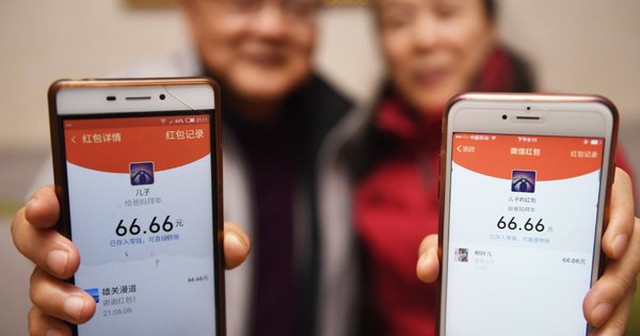 Một đôi vợ chồng tại TP Phúc Châu, tỉnh Phúc Kiến – Trung Quốc nhận lì xì điện tử từ con trai Ảnh: Tân Hoa Xã