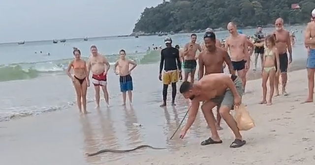 Video ghi lại sự việc cho thấy một số du khách đi nghỉ mát đã dũng cảm bắt con rắn cực độc tại bãi biển Kata ở Phuket, Thái Lan, vào ngày 3/12.
