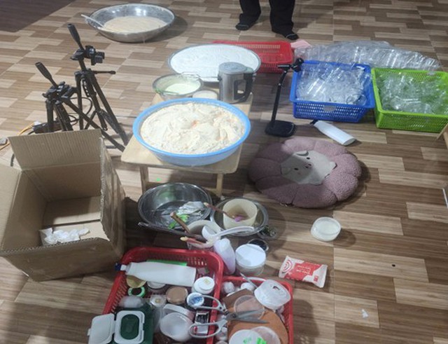 Cơ sở sử dụng các loại thau để chứa nguyên liệu sản xuất với thành phần chính là bột gạo, sau đó phối trộn với các loại hóa chất, mỹ phẩm khác được mua trôi nổi trên thị trường, trong đó có những sản phẩm có chữ nước ngoài (Trung Quốc) nhưng không có nhãn phụ theo quy định sau đó phối trộn và đóng chai, lọ theo khối lượng, dán nhãn thành các sản phẩm để kinh doanh qua các nền tàng, sàng thương mại điện tử.