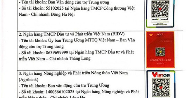 Bên cạnh đó, Ủy ban Trung ương MTTQ Việt Nam cũng thông tin về danh sách 10 tài khoản ngân hàng tiếp nhận ủng hộ tại 4 ngân hàng VietinBank, Vietcombank, BIDV, Agribank.