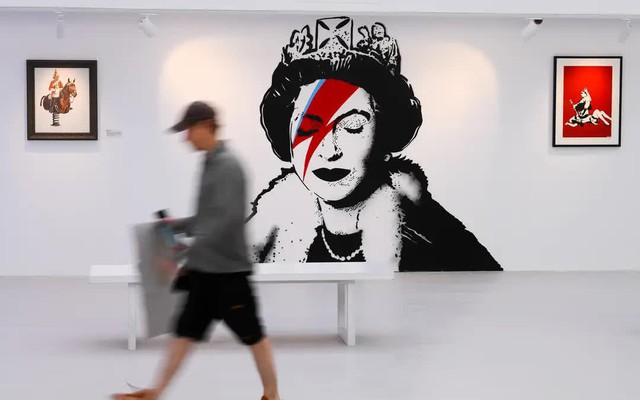 Bức chân dung Nữ hoàng Elizabeth II do Banksy vẽ, được trưng bày tại triển lãm Banksy Limitless ở London (Ảnh: Joe Maher/Getty Images)