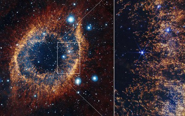 Hình ảnh Tinh vân Helix do kính viễn vọng VISTA chụp và hình ảnh chi tiết hơn về một phần của tinh vân được chụp bởi thiết bị NIRCam của kính viễn vọng Không gian James Webb, phản ánh chân thực cách mà Mặt Trời chúng ta hóa thành tinh vân trong tương lai - Ảnh: NASA/ESA/CSA
