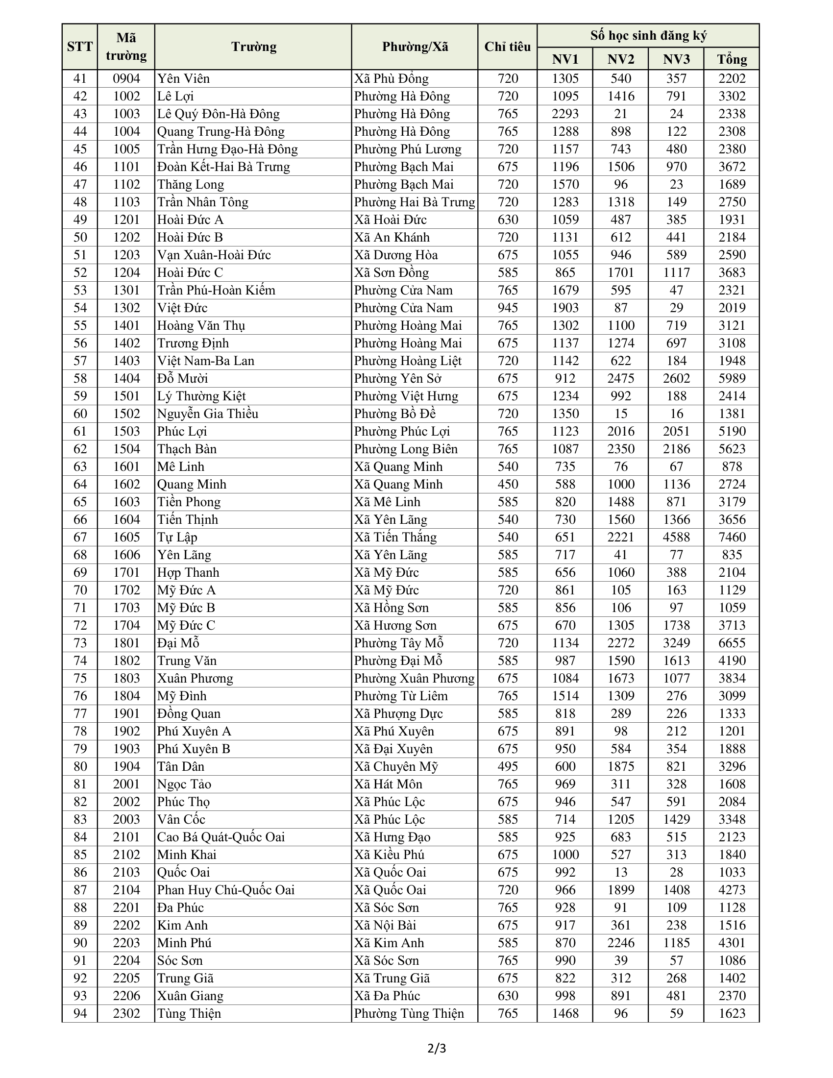 Chi tiết số lượng học sinh đăng ký vào từng trường trung học phổ thông công lập không chuyên và chỉ tiêu từng trường: