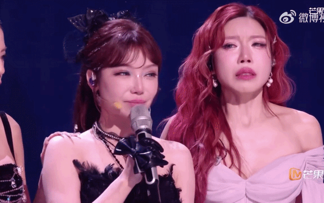 Trang Pháp ôm an ủi, động viên đồng đội sẽ dừng chân tại đêm thi tối nay. Ảnh: Weibo.