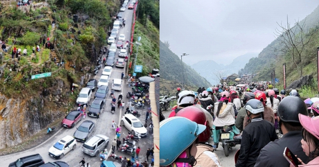 Hình ảnh ghi nhận tại Hà Giang cho thấy dòng người và phương tiện ken đặc trên tuyến đường đèo giữa núi rừng. Hàng nghìn du khách đổ về cùng thời điểm khiến con đường vốn nhỏ hẹp trở nên quá tải.