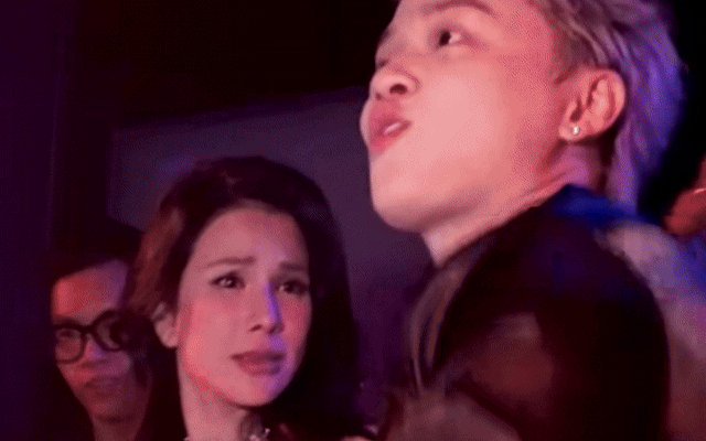Người đẹp sinh năm 1989 để lộ gương mặt biểu cảm nhăn mặt khó chịu, nhìn chằm chằm vào DJ