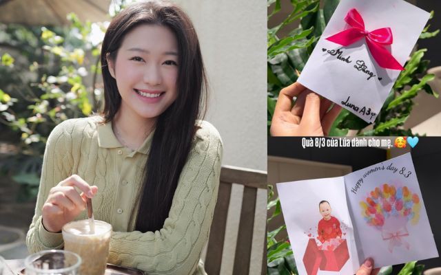 Điều khiến nàng WAG thích thú chính là sự chân thành và đáng yêu trong món quà. Không phải hoa hay quà sang trọng, tấm thiệp được làm thủ công lại mang đến cảm giác ấm áp rất riêng, đặc biệt nó đến từ cậu nhóc gần 3 tuổi Đoàn Minh Đăng (biệt danh bé Lúa). Hải My hạnh phúc viết: "Quà 8/3 của Lúa dành cho mẹ", kèm theo biểu tượng cảm xúc đầy yêu thương.