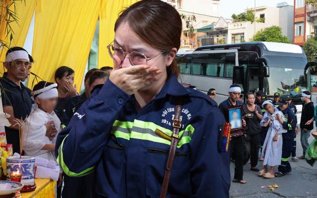 Trước khi rời đi, các thành viên Đội cứu hộ cứu nạn 116 cùng nhau đứng trước linh cữu, cúi đầu tiễn biệt rồi nhẹ nhàng ôm lấy cháu T.G.H – con trai anh H. Ánh mắt họ đỏ hoe, lặng im không nói nhưng đầy trĩu nặng.