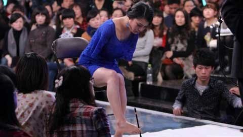 Lei Qingyao viết thư pháp bằng chân trong một cảnh