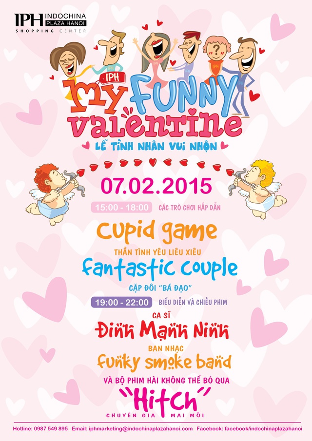 TTTM Indochina Plaza Hanoi – 241 Xuân Thủy, Cầu Giấy luôn là điểm đến yêu thích của người dân Hà Nội, đặc biệt là giới trẻ bởi thiết kế tinh tế, kiến trúc hiện đại và những sự kiện mang tính cộng đồng mới mẻ được thường xuyên tổ chức. Sự kiện My Funny Valentine được xây dựng theo concept hài hước, mới mẻ và hấp dẫn là quà tặng đặc biệt mà IPH gửi đến tất cả khách hàng nhân dịp lễ tình nhân 2015. Để biết thêm chi tiết xin vui lòng truy cập: https://www.facebook.com/Indochinaplazahanoi. |