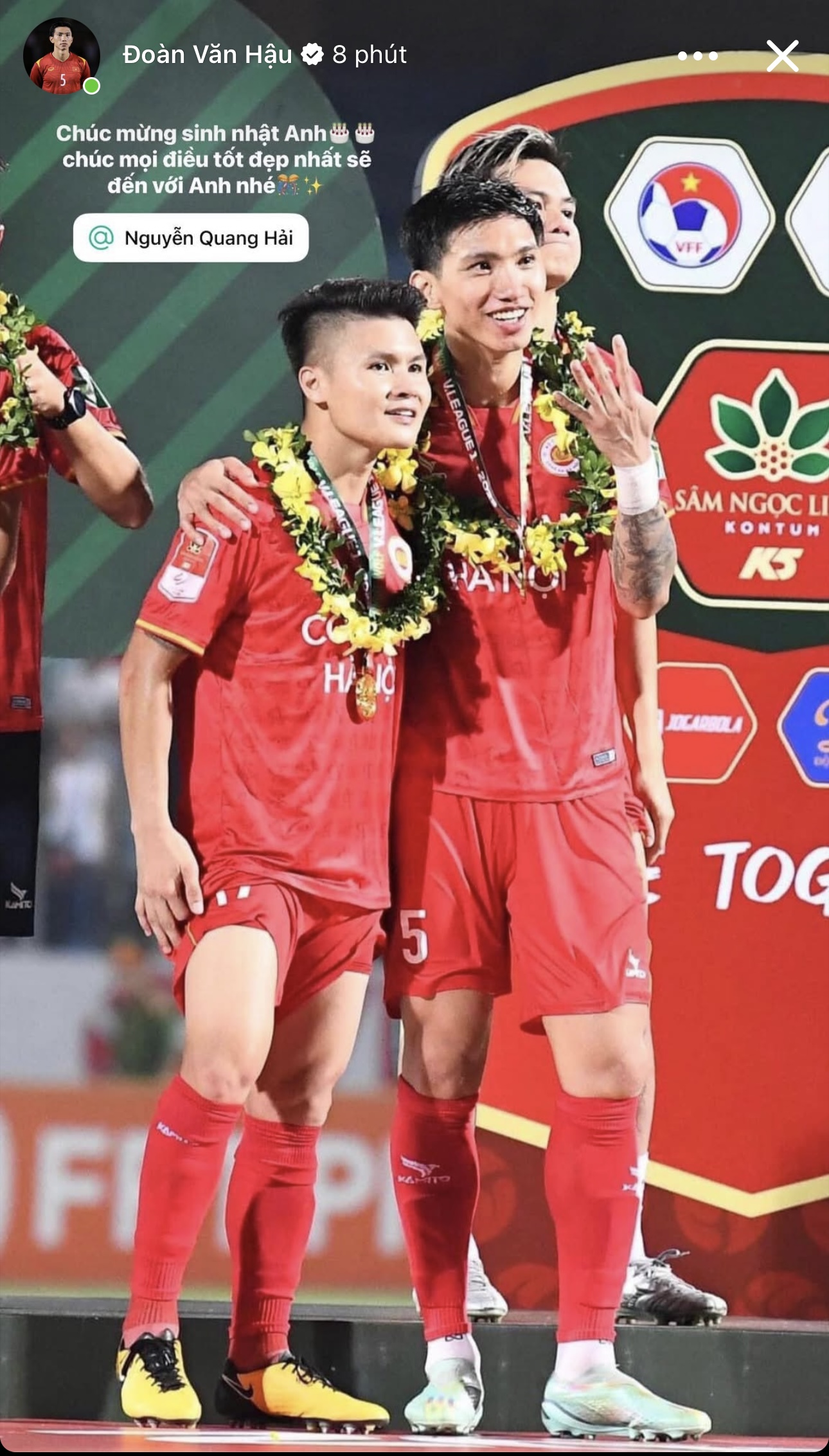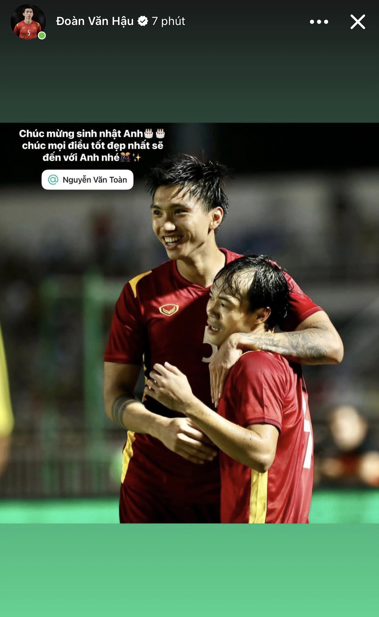 Mới đây, trên trang cá nhân, Đoàn Văn Hậu đã đăng tải loạt khoảnh khắc đầy kỷ niệm để gửi lời chúc mừng sinh nhật đến hai đàn anh thân thiết. Văn Hậu chia sẻ bức hình cùng Quang Hải rạng rỡ trên bục vinh quang trong màu áo CLB, cùng đeo huy chương và vòng hoa chiến thắng. Với Văn Toàn, hậu vệ sinh năm 1999 lại chọn một tấm hình đầy cảm xúc trong màu áo Đội tuyển Quốc gia. Khoảnh khắc hai anh em khoác vai nhau ăn mừng đã thay cho lời khẳng định về sự gắn bó bền bỉ qua nhiều thời kỳ của bóng đá Việt Nam.