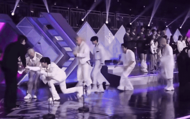 Các chàng trai Stray Kids còn phải khom hẳn người xuống vì không muốn để lộ rõ sự tương phản chiều cao với mỹ nam Cõng Anh Mà Chạy trên sân khấu