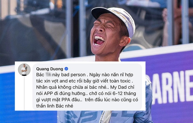Quang Dương viết: "Ngày nào năn nỉ hợp tác xin vợt... rồi bây giờ viết toàn toxic. Nhân quả không chừa ai bác nhé"