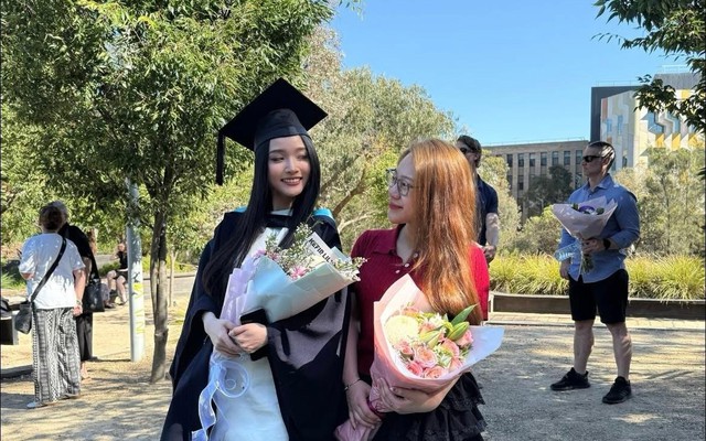 Trần Huỳnh Mỹ Kim (trái) rạng rỡ trong ngày nhận bằng tốt nghiệp Đại học La Trobe, Úc, hồi tháng 1/2026.