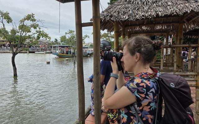 Không ít du khách nước ngoài tranh thủ ghi lại những bức ảnh kỷ niệm khi tham quan phố cổ Hội An đúng thời điểm ngập lụt.