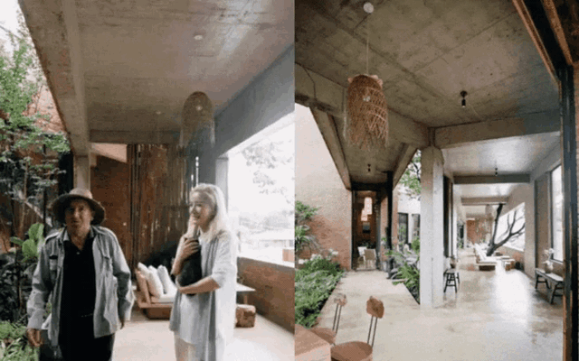 Ngôi nhà gạch đỏ được thiết kế bởi một kiến trúc sư độc lập, nằm trên sườn dốc gần 45 độ, có sân trong hình tam giác, giữ nguyên cây cổ thụ trước nhà - biểu tượng cho người cha.