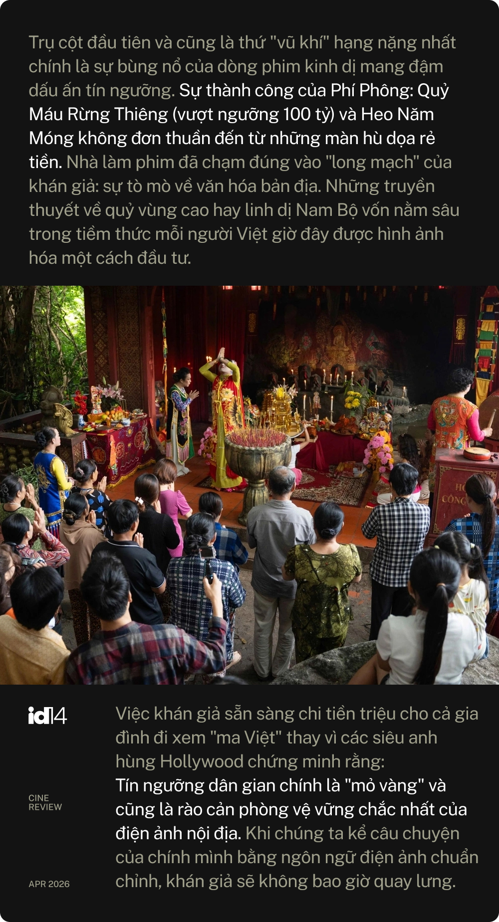 Trụ cột đầu tiên và cũng là thứ "vũ khí" hạng nặng nhất chính là sự bùng nổ của dòng phim kinh dị mang đậm dấu ấn tín ngưỡng. Sự thành công của Phí Phông: Quỷ Máu Rừng Thiêng (chạm mốc 134 tỷ) và Heo Năm Móng không đơn thuần đến từ những màn hù dọa rẻ tiền. Nhà làm phim đã chạm đúng vào "long mạch" của khán giả: sự tò mò về văn hóa bản địa. Những truyền thuyết về quỷ vùng cao hay linh dị Nam Bộ vốn nằm sâu trong tiềm thức mỗi người Việt giờ đây được hình ảnh hóa một cách đầu tư. Việc khán giả sẵn sàng chi tiền triệu cho cả gia đình đi xem "ma Việt" thay vì các siêu anh hùng Hollywood chứng minh rằng: Tín ngưỡng dân gian chính là "mỏ vàng" và cũng là rào cản phòng vệ vững chắc nhất của điện ảnh nội địa. Khi chúng ta kể câu chuyện của chính mình bằng ngôn ngữ điện ảnh chuẩn chỉnh, khán giả sẽ không bao giờ quay lưng.
