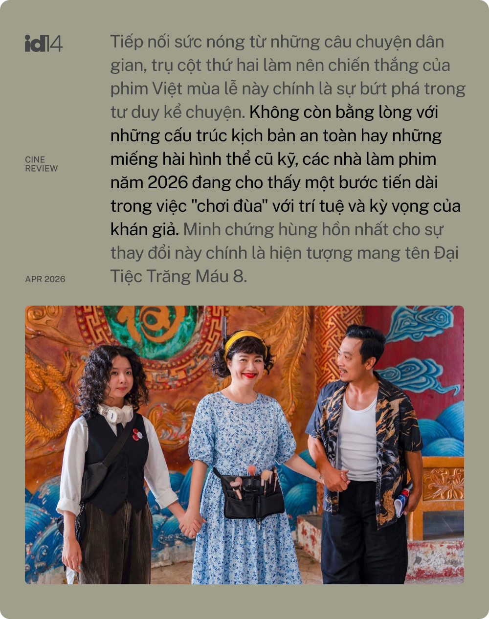 Tiếp nối sức nóng từ những câu chuyện dân gian, trụ cột thứ hai làm nên chiến thắng của phim Việt mùa lễ này chính là sự bứt phá trong tư duy kể chuyện. Không còn bằng lòng với những cấu trúc kịch bản an toàn hay những miếng hài hình thể cũ kỹ, các nhà làm phim năm 2026 đang cho thấy một bước tiến dài trong việc "chơi đùa" với trí tuệ và kỳ vọng của khán giả. Minh chứng hùng hồn nhất cho sự thay đổi này chính là hiện tượng mang tên Đại Tiệc Trăng Máu 8.