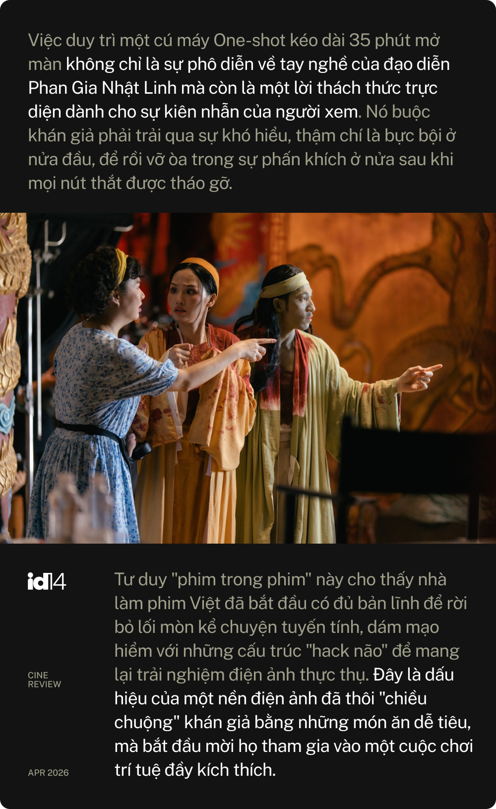 Điểm khiến giới mộ điệu phải ngả mũ chính là sự quyết liệt trong kỹ thuật kể chuyện. Việc duy trì một cú máy One-shot kéo dài 35 phút mở màn không chỉ là sự phô diễn về tay nghề của đạo diễn Phan Gia Nhật Linh mà còn là một lời thách thức trực diện dành cho sự kiên nhẫn của người xem. Nó buộc khán giả phải trải qua sự khó hiểu, thậm chí là bực bội ở nửa đầu, để rồi vỡ òa trong sự phấn khích ở nửa sau khi mọi nút thắt được tháo gỡ. Tư duy "phim trong phim" này cho thấy nhà làm phim Việt đã bắt đầu có đủ bản lĩnh để rời bỏ lối mòn kể chuyện tuyến tính, dám mạo hiểm với những cấu trúc "hack não" để mang lại trải nghiệm điện ảnh thực thụ. Đây là dấu hiệu của một nền điện ảnh đã thôi "chiều chuộng" khán giả bằng những món ăn dễ tiêu, mà bắt đầu mời họ tham gia vào một cuộc chơi trí tuệ đầy kích thích.