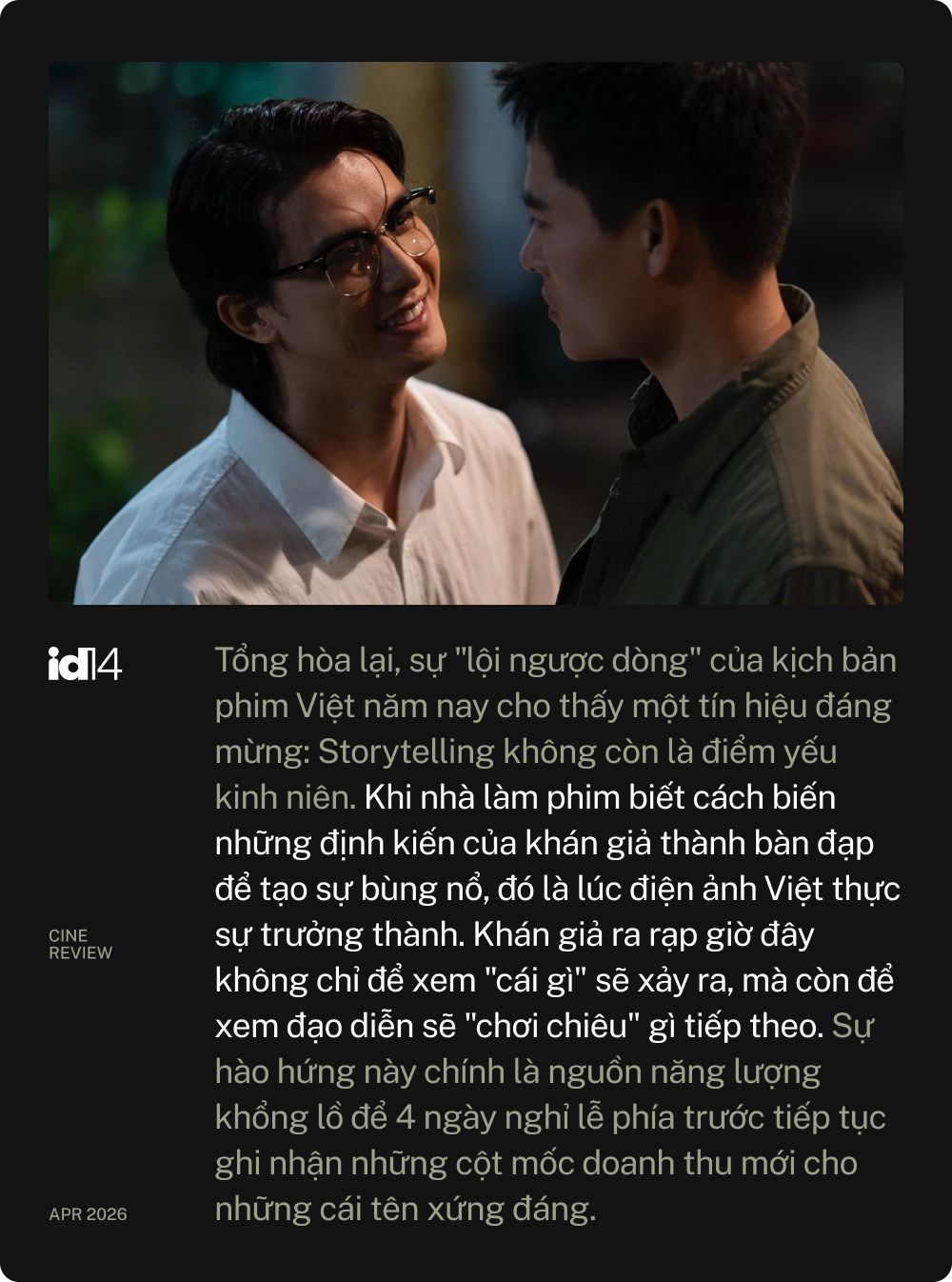 Tổng hòa lại, sự "lội ngược dòng" của kịch bản phim Việt năm nay cho thấy một tín hiệu đáng mừng: Storytelling không còn là điểm yếu kinh niên. Khi nhà làm phim biết cách biến những định kiến của khán giả thành bàn đạp để tạo sự bùng nổ, đó là lúc điện ảnh Việt thực sự trưởng thành. Khán giả ra rạp giờ đây không chỉ để xem "cái gì" sẽ xảy ra, mà còn để xem đạo diễn sẽ "chơi chiêu" gì tiếp theo. Sự hào hứng này chính là nguồn năng lượng khổng lồ để 4 ngày nghỉ lễ phía trước tiếp tục ghi nhận những cột mốc doanh thu mới cho những cái tên xứng đáng.