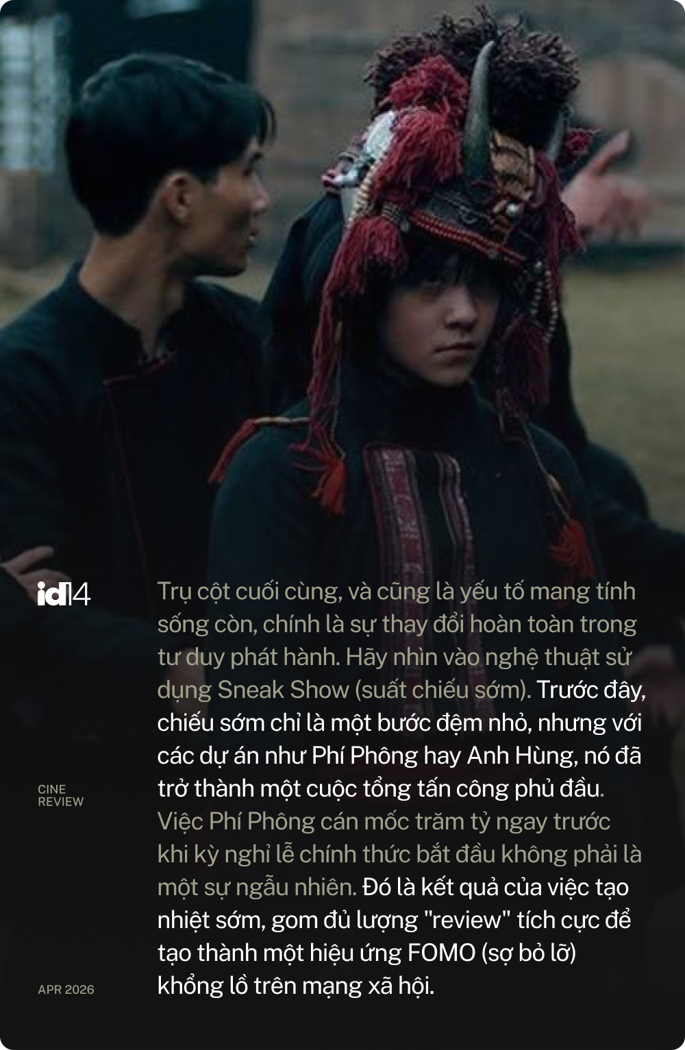Trụ cột cuối cùng, và cũng là yếu tố mang tính sống còn, chính là sự thay đổi hoàn toàn trong tư duy phát hành. Hãy nhìn vào nghệ thuật sử dụng Sneak Show (suất chiếu sớm). Trước đây, chiếu sớm chỉ là một bước đệm nhỏ, nhưng với các dự án như Phí Phông hay Anh Hùng, nó đã trở thành một cuộc tổng tấn công phủ đầu. Việc Phí Phông cán mốc trăm tỷ ngay trước khi kỳ nghỉ lễ chính thức bắt đầu không phải là một sự ngẫu nhiên. Đó là kết quả của việc tạo nhiệt sớm, gom đủ lượng "review" tích cực để tạo thành một hiệu ứng FOMO (sợ bỏ lỡ) khổng lồ trên mạng xã hội. Khi bước vào kỳ nghỉ, khán giả ra rạp không phải để chọn phim, mà họ ra rạp để xem bộ phim mà "cả thế giới đang bàn tán". Các nhà phát hành Việt đã rất khôn ngoan khi biến mỗi suất chiếu sớm thành một "sự kiện văn hóa", khiến phim Việt trở thành chủ đề thảo luận duy nhất trên các diễn đàn, từ truyền thuyết quỷ rừng cho đến diễn xuất của Thái Hòa.