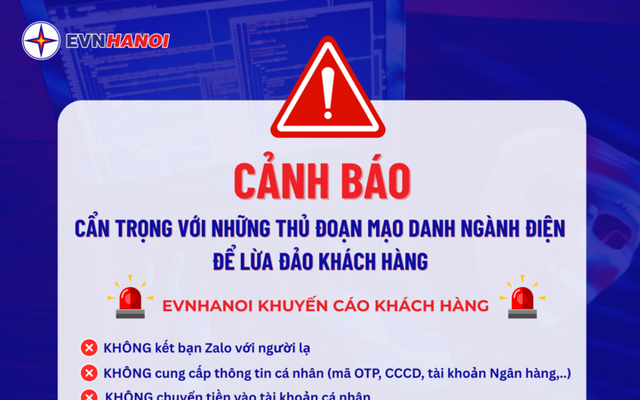 EVNHANOI khẳng định, mọi thông tin liên quan đến tiền điện, lịch tạm ngừng cung cấp điện, thông báo thay đổi dịch vụ… đều được thực hiện qua các kênh chính thống của Tổng công ty. Tuyệt đối không có việc yêu cầu khách hàng cung cấp tài khoản cá nhân, chuyển tiền qua bên thứ ba, hoặc truy cập đường link lạ.