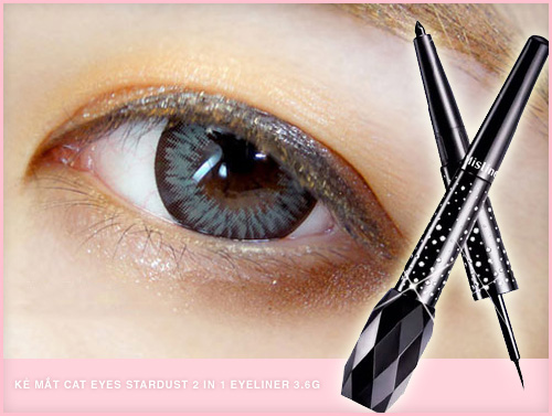 Để tạo mắt to tròn, tất nhiên không thể thiếu vai trò của eyeliner rồi. Tớ sử dụng eyeliner màu đen của Mistine. Với một đầu là ngòi mắt nước và đầu còn lại là ngòi sáp chì. Sản phẩm này rất tiện dụng khi bạn muốn tạo nhiều kiểu mắt kẻ eyeliner khác nhau.