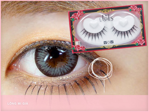 Các bạn nên sử dụng hai loại mi giả để gắn lên mi. Phía mi dưới sẽ là loại mi giả có đường gắn mi trong suốt của Ameli, còn phía trên là loại mi giả tự nhiên dài 11 mm của VOV.