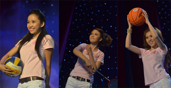 Vòng thi trang phục thể thao khá năng động với trang phục áo đồng phục màu hồng cùng các đạo cụ thể thao thể hiện sự khỏe khoắn của các