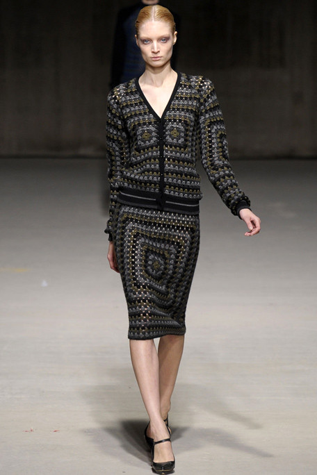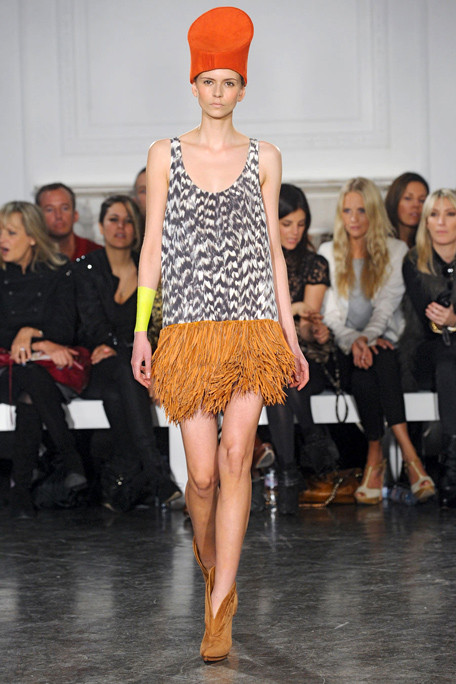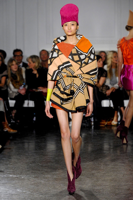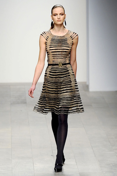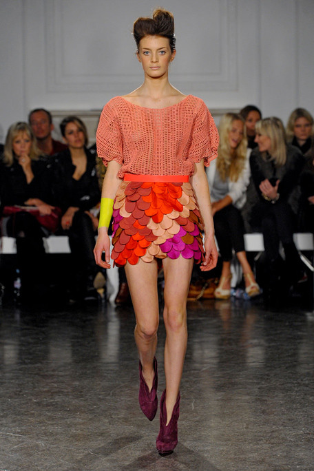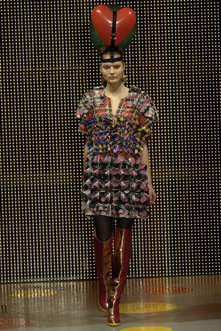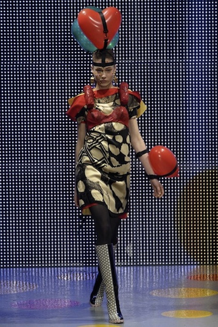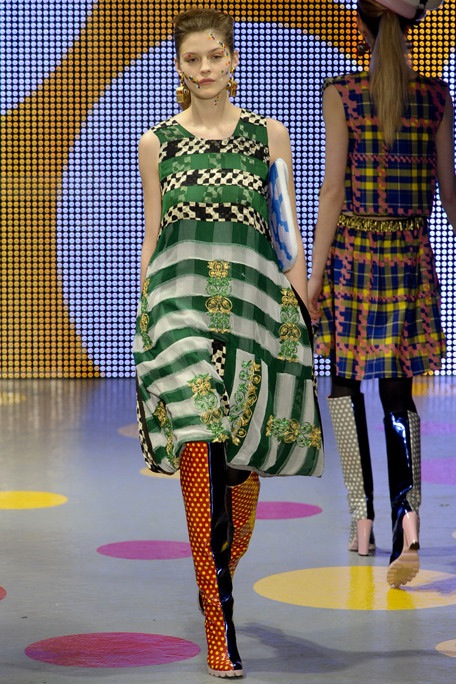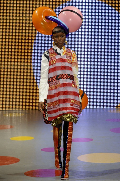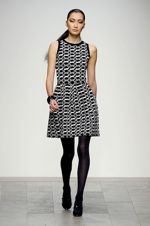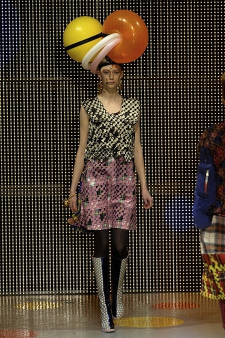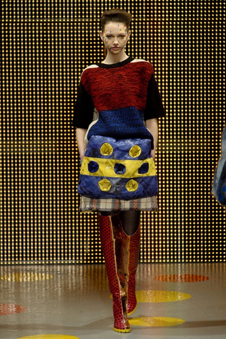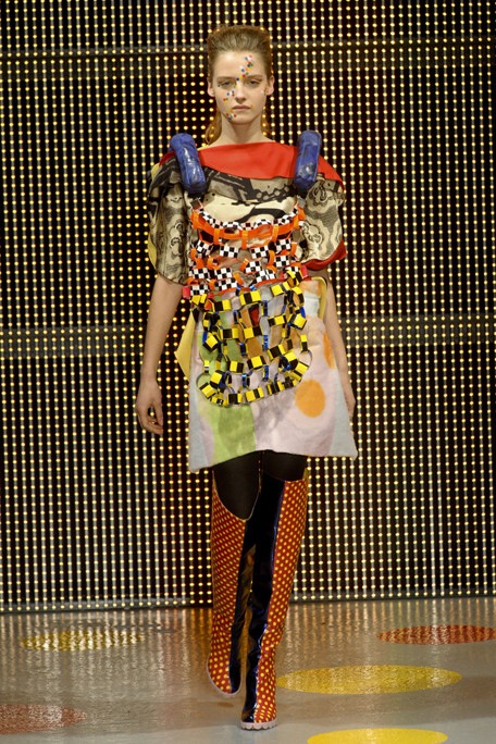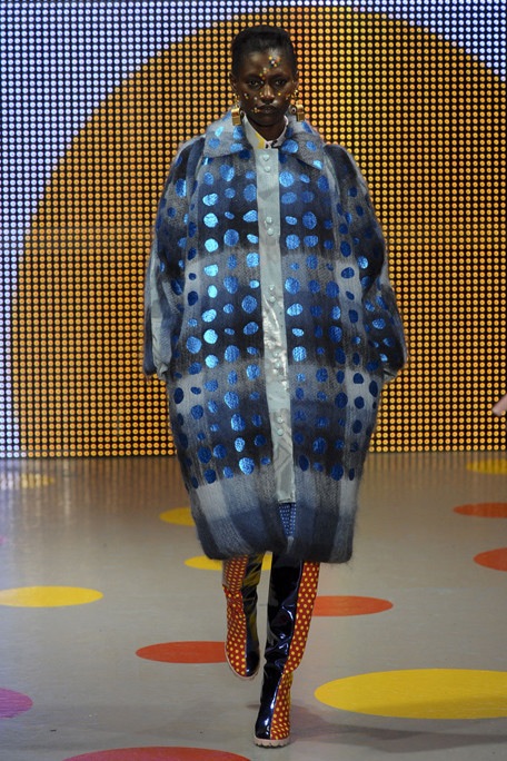 "Hoa mắt, choáng ngợp" là những từ ngữ cần thốt ra để diễn tả những bộ trang phục của Louise Gray. Họa tiết chấm bi và bàn cờ nổi trội trên thiết kế "quái tính" chỉ bao gồm minidress và boots. Đôi lúc có cảm tưởng, show của Louise Gray như đưa các tín đồ thời trang vào mê cung ảo giác của họa tiết và màu sắc.