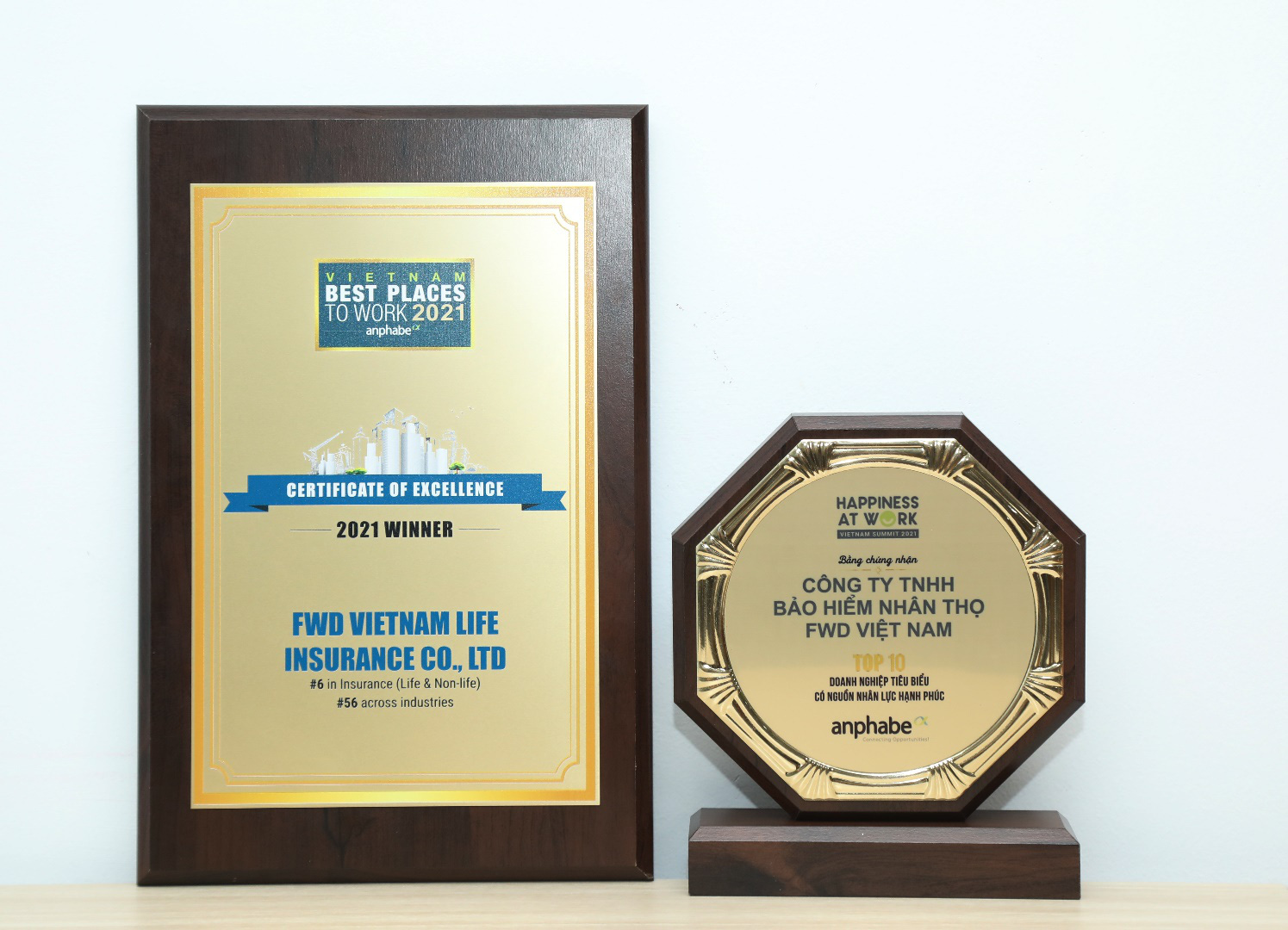 Bên cạnh giải thưởng Doanh nghiệp tiêu biểu có Nguồn Nhân Lực Hạnh Phúc, FWD Việt Nam lần thứ 4 liên tiếp nằm trong "Top 100 nơi làm việc tốt nhất Việt Nam" năm 2021, xếp hạng 56 toàn ngành.