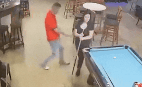 Trong những giây trước khi cú đấm xảy ra, người vợ đã cố chen vào can ngăn. Tuy nhiên, người chồng đang tức giận đã đẩy qua, vô tình làm cây cơ bi-a va vào mặt cô. Người phụ nữ ôm má đau đớn, trong khi một người đứng gần đó vội chạy tới, ra hiệu yêu cầu người chồng rời đi.