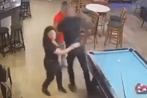 Tuy nhiên, người chồng - chứng kiến toàn bộ sự việc - lập tức vòng qua bàn bi-a, lao tới và tung một cú đấm thẳng vào mặt kẻ quấy rối. Cú đấm mạnh khiến người này ngã gục ngay tại chỗ, suýt nữa đập đầu vào ghế bar.