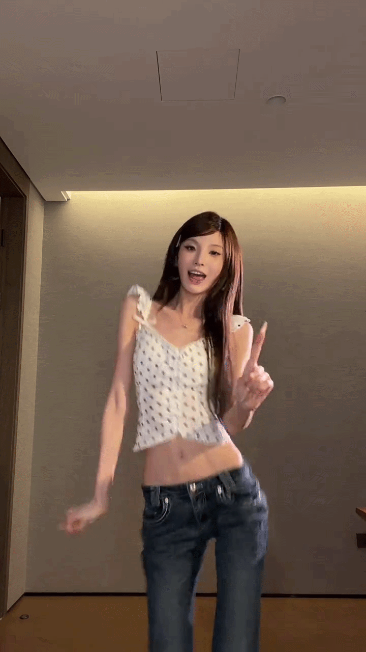 Trong đoạn clip đang viral, Hyemin diện một set đồ khá đơn giản gồm áo hai dây crop top dáng ôm họa tiết nhỏ kết hợp cùng quần jeans cạp thấp, dành tâm điểm cho vòng eo mỏng dính. Tuy nhiên, chính thiết kế ôm sát và phần áo hở eo lại càng làm lộ rõ vóc dáng gầy đến mức đáng báo động.