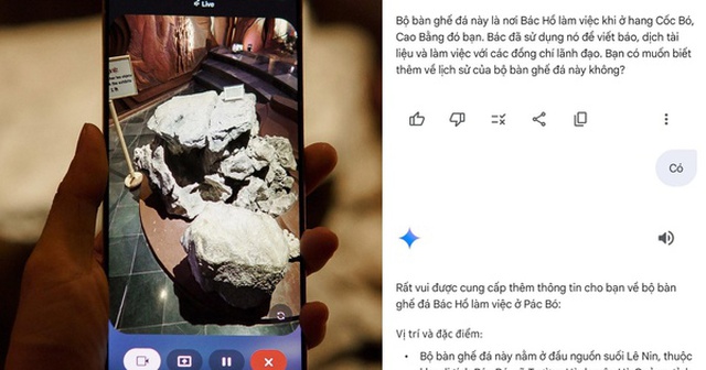 Hành trình bắt đầu từ khu trưng bày bộ bàn ghế đá tại Pác Bó (Cao Bằng), nơi Chủ tịch Hồ Chí Minh từng sống và làm việc trong những ngày đầu trở về Tổ quốc để lãnh đạo cách mạng. Khi camera Galaxy S25 hướng vào hiện vật, Gemini Live lập tức tái hiện bối cảnh lịch sử: nơi Người vừa dịch sách, viết báo, vừa họp bàn cùng Trung ương để vạch ra con đường giành độc lập. Trong khung cảnh đơn sơ, mỗi viên đá, mỗi bề mặt gỗ đều mang trong mình dấu ấn khởi nguyên của một thời kỳ oanh liệt.