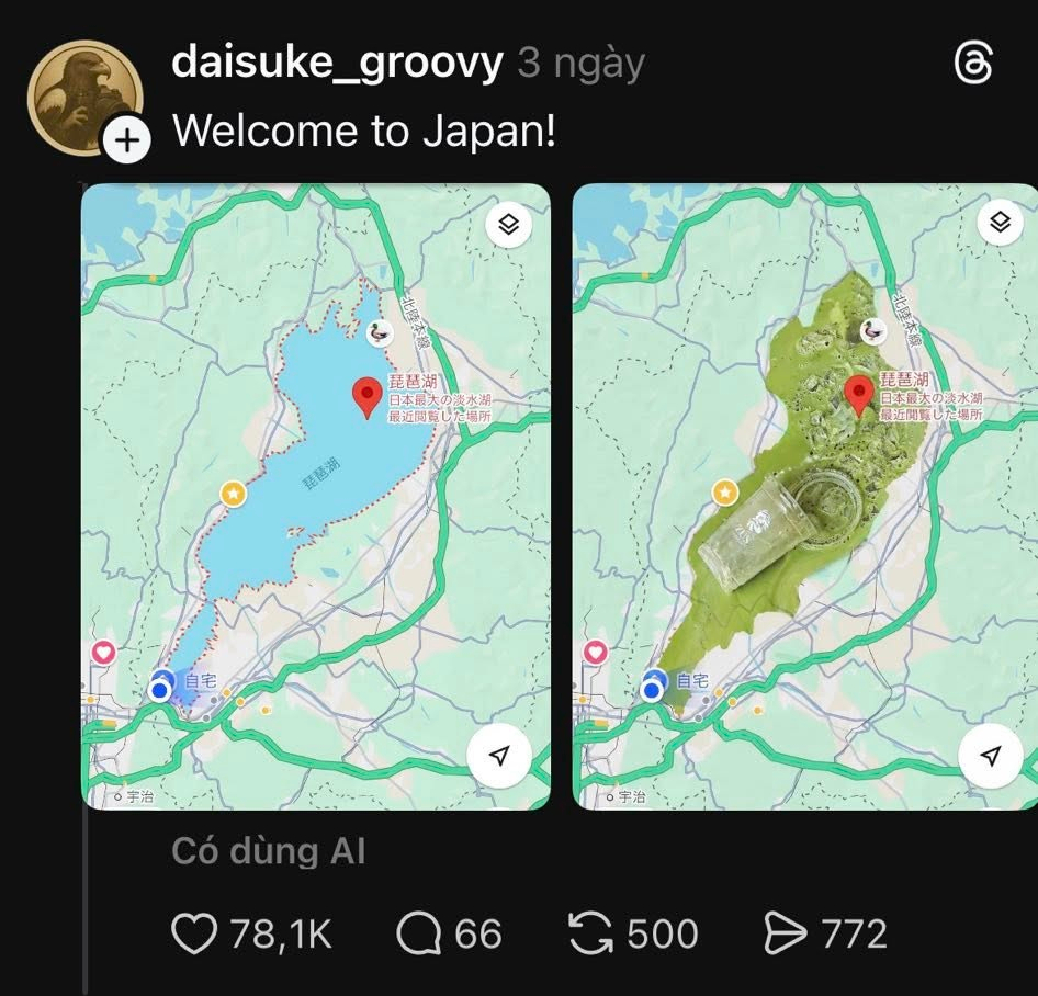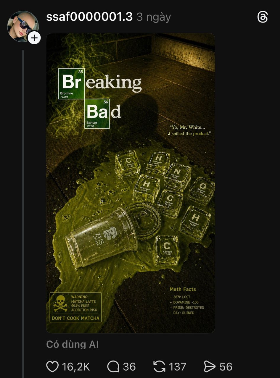 Không dừng lại ở đó, bức ảnh còn được thổi hồn qua hàng loạt phong cách đa dạng. Từ việc khéo léo lồng ghép hình ảnh ly matcha vào poster mang đậm phong cách của series phim truyền hình đình đám "Breaking Bad" hay liên tưởng và biến tấu thành bản đồ một khu vực hồ tại Nhật Bản, thậm chí là biến thành một mẫu áo thun thời trang mang phong cách tối giản, giao diện màn hình khóa điện thoại... Từ một hình ảnh "sự cố" ly matcha đổ, cư dân Threads đã biến nó trở thành một "vương quốc matcha" với vô số bình luận và sự sáng tạo không biên giới.