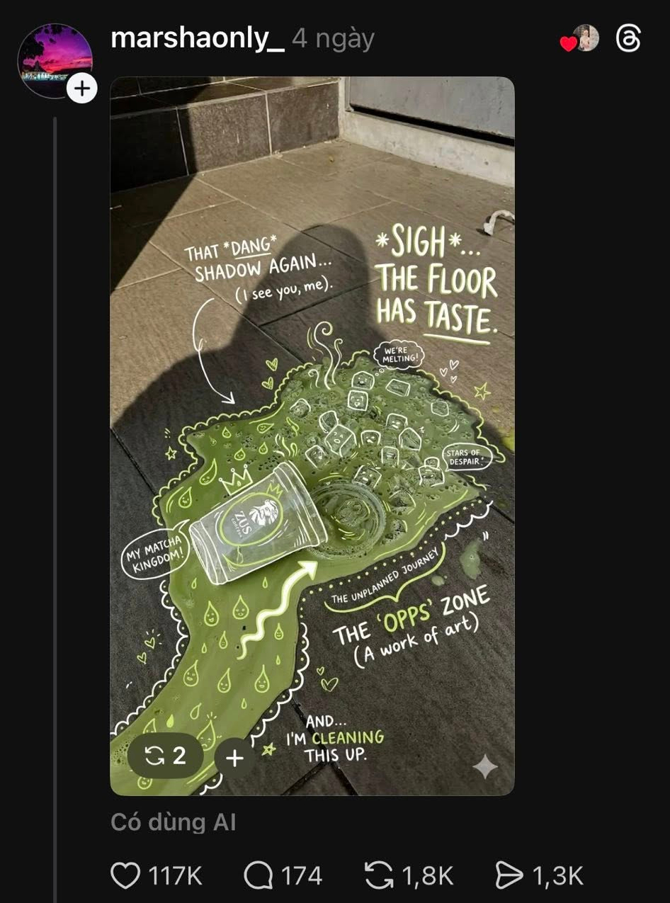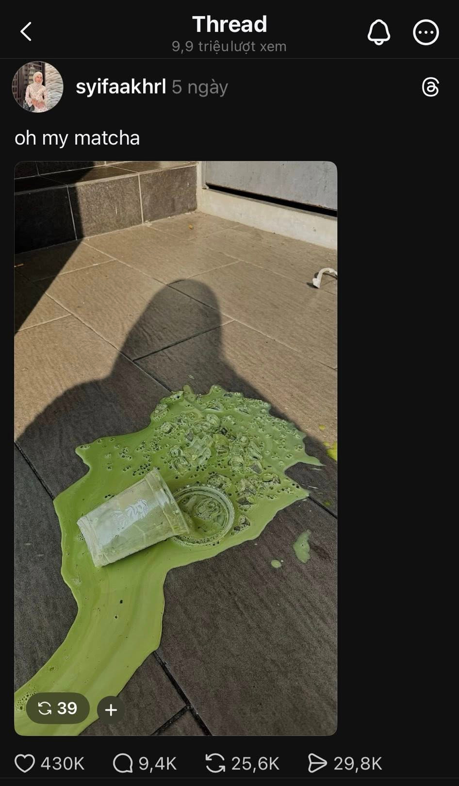 Nếu hỏi đâu là bài đăng viral nhất trên "Threads City" ngay lúc này thì đó chính là hình ảnh của một ly matcha bị đổ tung tóe trên nền gạch. Nhưng chỉ với hình ảnh đó và dòng trạng thái ngắn gọn "oh my matcha", bài đăng này đã hút gần 10 triệu lượt xem cùng hàng trăm nghìn lượt tương tác chỉ trong vài ngày ngắn ngủi. Không ai có thể ngờ rằng, một sự cố vụn vặt trong đời sống thường nhật lại là chất xúc tác tạo khiến nó viral đến vậy. Nhưng đâu là lý do khiến ly matcha này có lượng tương tác khủng đến vậy?