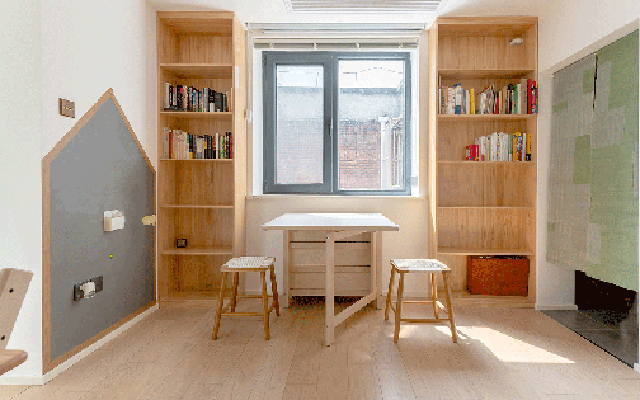 Một chiếc bàn ăn gấp giúp linh hoạt trong sinh hoạt hàng ngày: có thể mở ra khi ăn và gập lại để tăng diện tích chơi cho trẻ.
