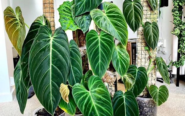 Trầu bà Philodendron gloriosum gây ấn tượng mạnh nhờ những chiếc lá to bản, hình tim và bề mặt nhung mịn. Lá có màu xanh đậm, nổi bật với đường gân sáng chạy rõ ràng, tạo cảm giác sang trọng ngay từ cái nhìn đầu tiên. Khi đặt trong phòng khách, cây giúp không gian trở nên nổi bật mà vẫn giữ được vẻ tinh tế, không quá cầu kỳ. Đây là loại cây thường được chọn để đặt trên kệ thấp, bàn console hoặc góc bàn trà nhằm tạo điểm nhấn mềm mại. Tán lá rộng nhưng mọc gọn, không vươn quá cao nên phù hợp với nhiều kiểu nội thất hiện đại. Khi trồng trong chậu gốm hoặc chậu đá đơn giản, vẻ đẹp của lá càng được tôn lên rõ rệt. Philodendron gloriosum cũng thích ánh sáng gián tiếp và môi trường trong nhà, chỉ cần tưới nước vừa phải và giữ đất thoáng là cây có thể phát triển ổn định lâu dài.