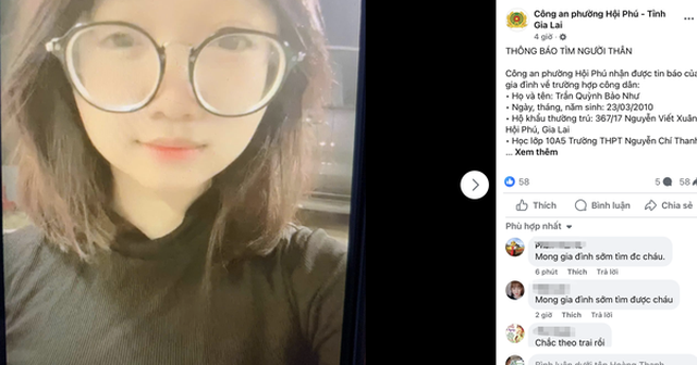 Ngày 20-10, Công an phường Hội Phú, tỉnh Gia Lai đã phát đi thông báo tìm em Trần Quỳnh Bảo Như (SN 2010, học sinh lớp 10, Trường THPT Nguyễn Chí Thanh, phường Hội Phú) mất tích sau khi đi học.