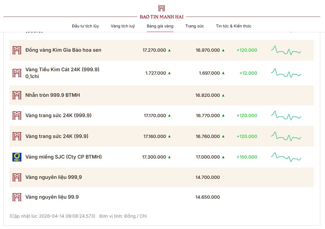 Thị trường vàng trong nước phiên sáng ngày 14/04/2026 chứng kiến những bước nhảy vọt về giá, thiết lập những cột mốc mới. So với cùng thời điểm ngày hôm qua, giá vàng tại hầu hết các thương hiệu lớn như SJC, Phú Quý và Bảo Tín Mạnh Hải tăng trung bình từ 1 triệu đến 1,5 triệu đồng mỗi lượng tùy loại. Đà tăng này được củng cố bởi cả yếu tố nội lực là nhu cầu tích trữ tăng cao và yếu tố ngoại lực từ sàn giao dịch thế giới.