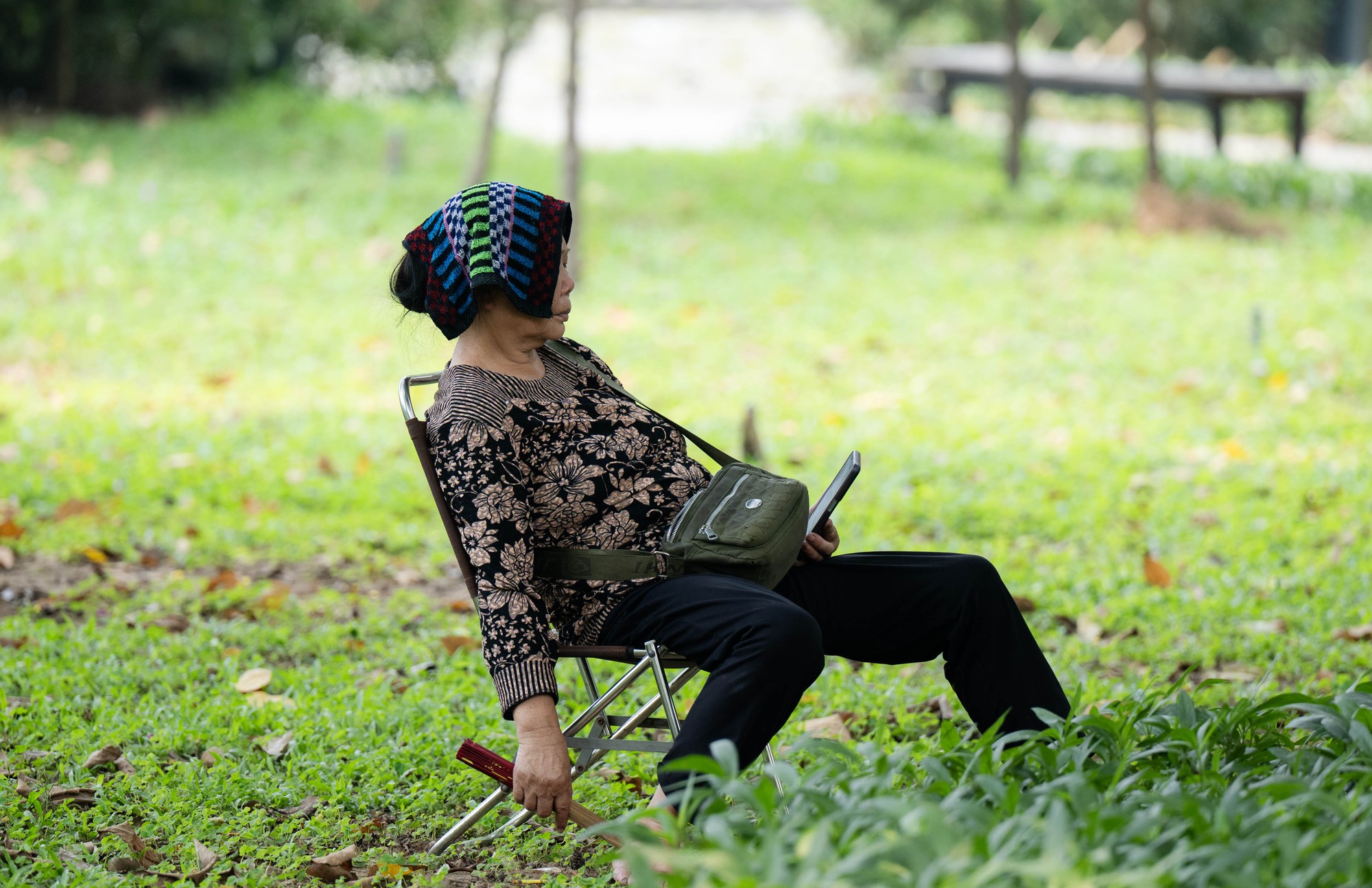 Theo quan sát, những vị trí có bóng râm dưới tán cây nhanh chóng kín chỗ. Người lao động tận dụng áo chống nắng, bìa carton hoặc túi xách cá nhân trải xuống thảm cỏ để nằm nghỉ, nhiều người dùng ba lô làm gối. Để giảm bớt cảm giác oi nóng, không ít người mang theo quạt tích điện cầm tay. Trong khi đó, một số khác lựa chọn khu vực gầm cầu vượt nơi có bóng râm và phần nào dịu nhiệt hơn, làm chỗ chợp mắt tạm thời.